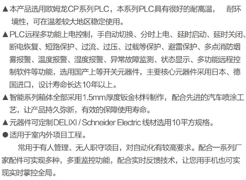 產品特點:專業為高端顯示屏項目設計,主要組成部分包括:PLC智能控制單元,通訊擴展板,各種監測傳感器,配電柜,電子計算機,數據通信接口或串口光纖調制解調器。多個PLC配合使用可以構成控制集群網,從而實現多個配電柜的自動操作和控制,滿足特殊行業需要多臺配電柜控制的配置要求。 榮富智能控制柜主要功能包括:PLC遠程多功能上電控制、手自動切換、分時上電、延時啟動、延時關閉、斷電恢復、短路、過流、過壓、過載、避雷等保護、能實現多點消防煙霧報警、溫度報警、濕度報警、異常故障監測、狀態顯示、多功能遠程控制軟件等功能。