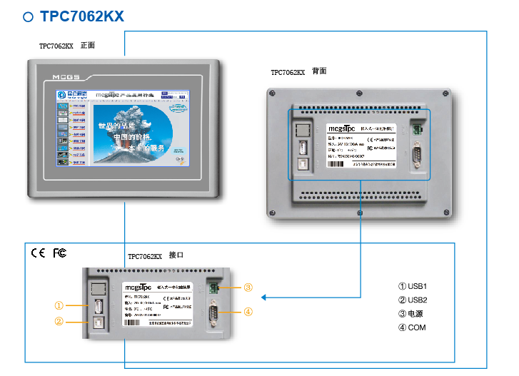 TPC7062KX,是一套以嵌入式低功耗CPU為核心(主頻400MHz)的高性能嵌入式一體化觸摸屏。該產品設計采用了7英寸高亮度TFT液晶顯示屏(分辨率800×480),四線電阻式觸摸屏(分辨率4096×4096)。同時還預裝了MCGS嵌入式組態軟件(運行版),具備強大的圖像顯示和數據處理功能。