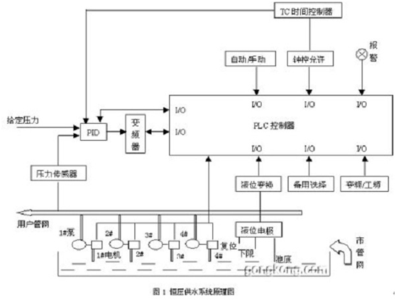 本系統(tǒng)采用易能變頻器,利用邏輯電路定時循環(huán)啟動兩臺水泵。這樣既能做到一用一備,又能達(dá)到定時巡檢功能。其恒壓精度達(dá)到0.01kg。