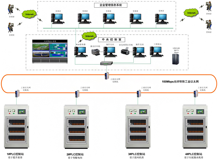 自動(dòng)化系統(tǒng)有1個(gè)中央1個(gè)中央控制室、4個(gè)現(xiàn)場(chǎng)PLC控制站組成。現(xiàn)場(chǎng)PLC控制站,由可編程序控制器(PLC)系統(tǒng)及檢測(cè)儀表組成,對(duì)污水處理廠(chǎng)各工藝過(guò)程進(jìn)行分散控制;再由中央控制室(CCR),對(duì)全廠(chǎng)實(shí)行集中管理。中央控制室、PLC控制站之間的數(shù)據(jù)通訊采用高速的、實(shí)時(shí)的工業(yè)以太網(wǎng),網(wǎng)絡(luò)結(jié)構(gòu)為環(huán)形,通訊速率為100Mbps,傳輸介質(zhì)為光纖。中央控制站設(shè)于綜合樓中控室;現(xiàn)場(chǎng)控制站設(shè)4個(gè),分別位于進(jìn)水泵房(1#PLC控制站)、變配電間(2#PLC控制站)、鼓風(fēng)機(jī)房(3#PLC控制站)、污泥濃縮脫水機(jī)房(4#PLC控制站)。案例演示